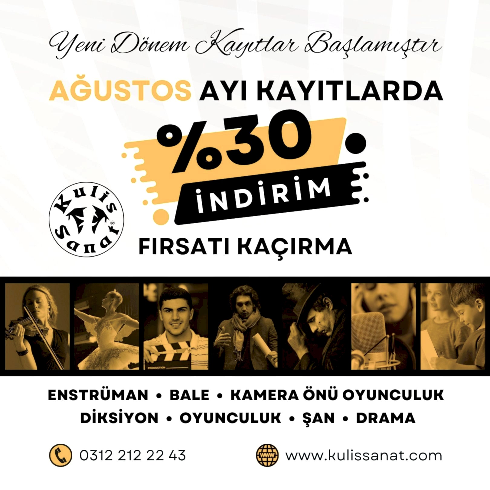 Kulis Sanat ailesi olarak Klasik Bale, Yaratıcı Drama, Modern Dans, Oyunculuk, Kamera Önü Oyunculuk, Diksiyon, Şan, Piyano, Keman, Gitar, Flüt ve Batı Müziği enstrümanlarının tümünde alanında uzman eğitmenlerimizle birlikte sizleri akademimize davet ediyoruz. Ücretsiz deneme dersleri ve detaylı bilgi için akademimizle iletişime geçebilirsiniz.